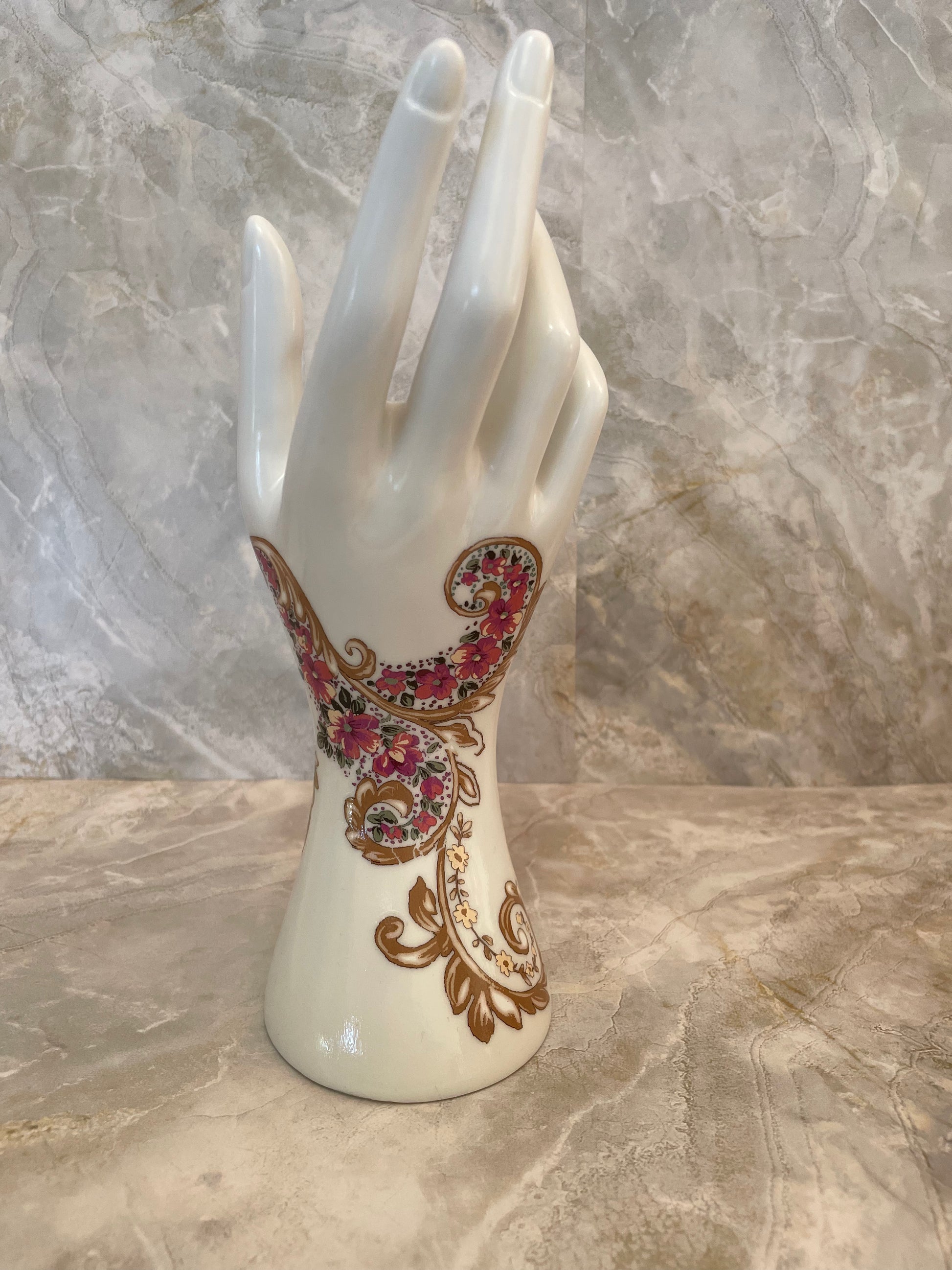 The ring holder has been enhanced with beautiful scroll transfers from Dixie Belle, carefully varnished for lasting beauty—a fun and elegant way to showcase your rings. Display your rings on the fingers of the hand for a playful and elegant way to organize your collection, making it both functional and visually appealing.