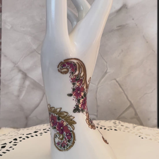 This charming upcycled hand-shaped jewelry display stand transforms a plain plastic ring holder into a unique, decorative piece.