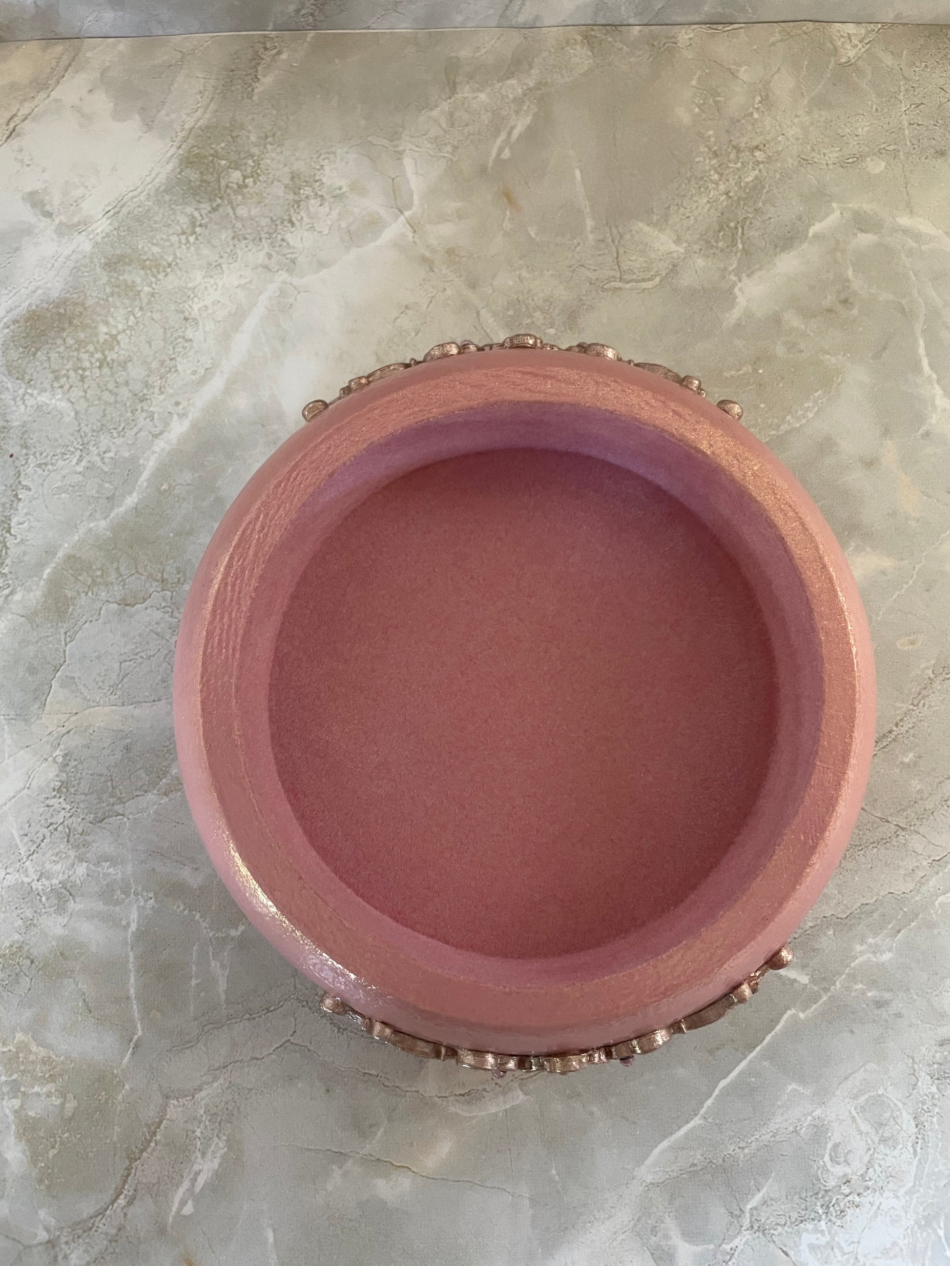 The base of the box is adorned with two decorative clay moulds, each highlighted with a few rhinestones for subtle sparkle. When opened, a lovely surprise awaits inside—a butterfly and rose design transfer from Essential Stencil decorates the inner lid, paired with a soft pink velvet interior made using Pentart’s velvet powder, creating a luxurious place to store your jewelry or keepsakes.