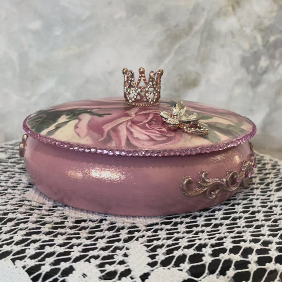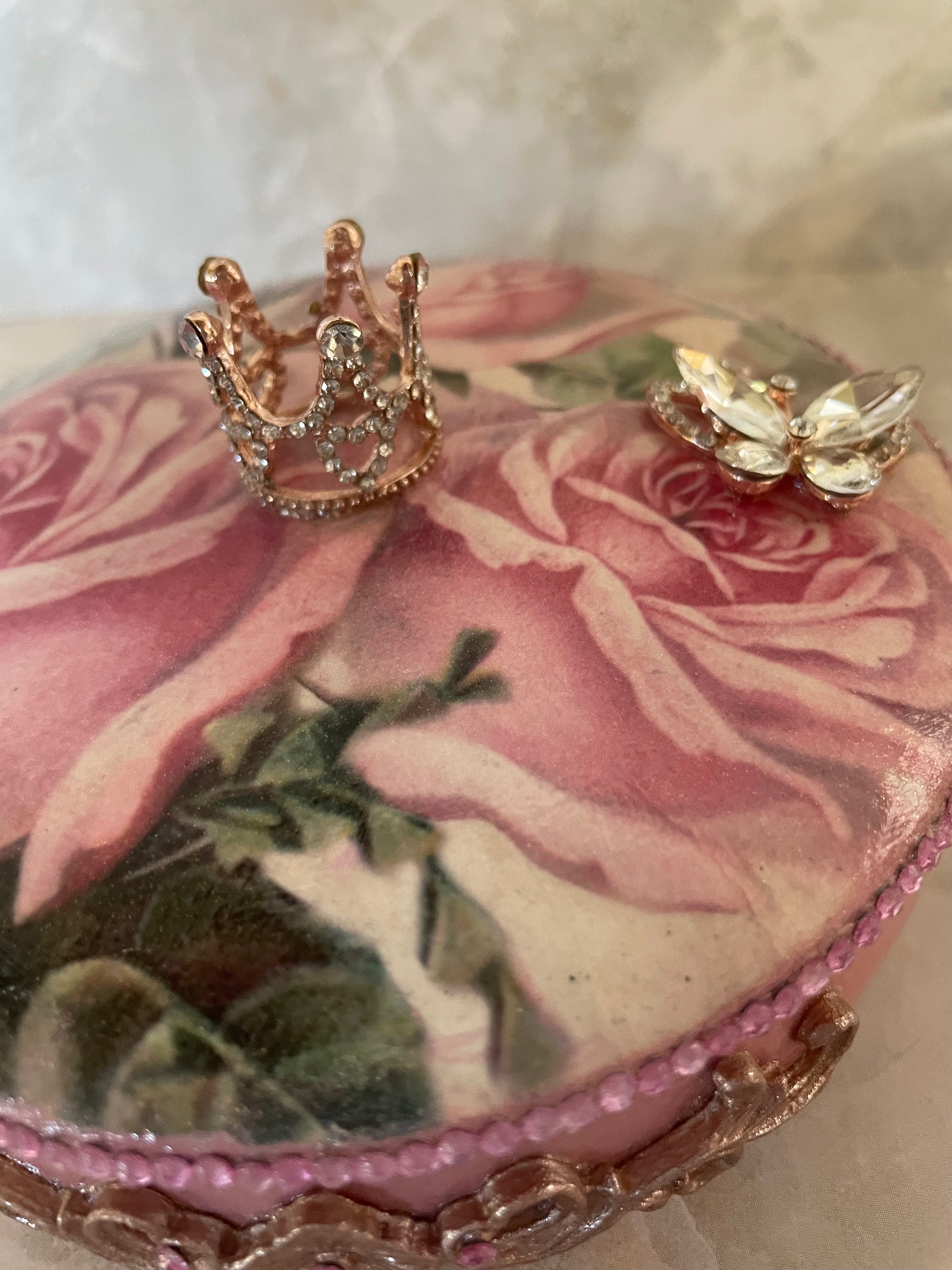 The lid features delicate pink roses from Reba Rose Creations rice paper, accented by a rose gold crown and a sparkling butterfly brooch from Totally Dazzled. A rim of hand-applied pink rhinestones encircles the lid, adding a graceful touch of shimmer and charm.