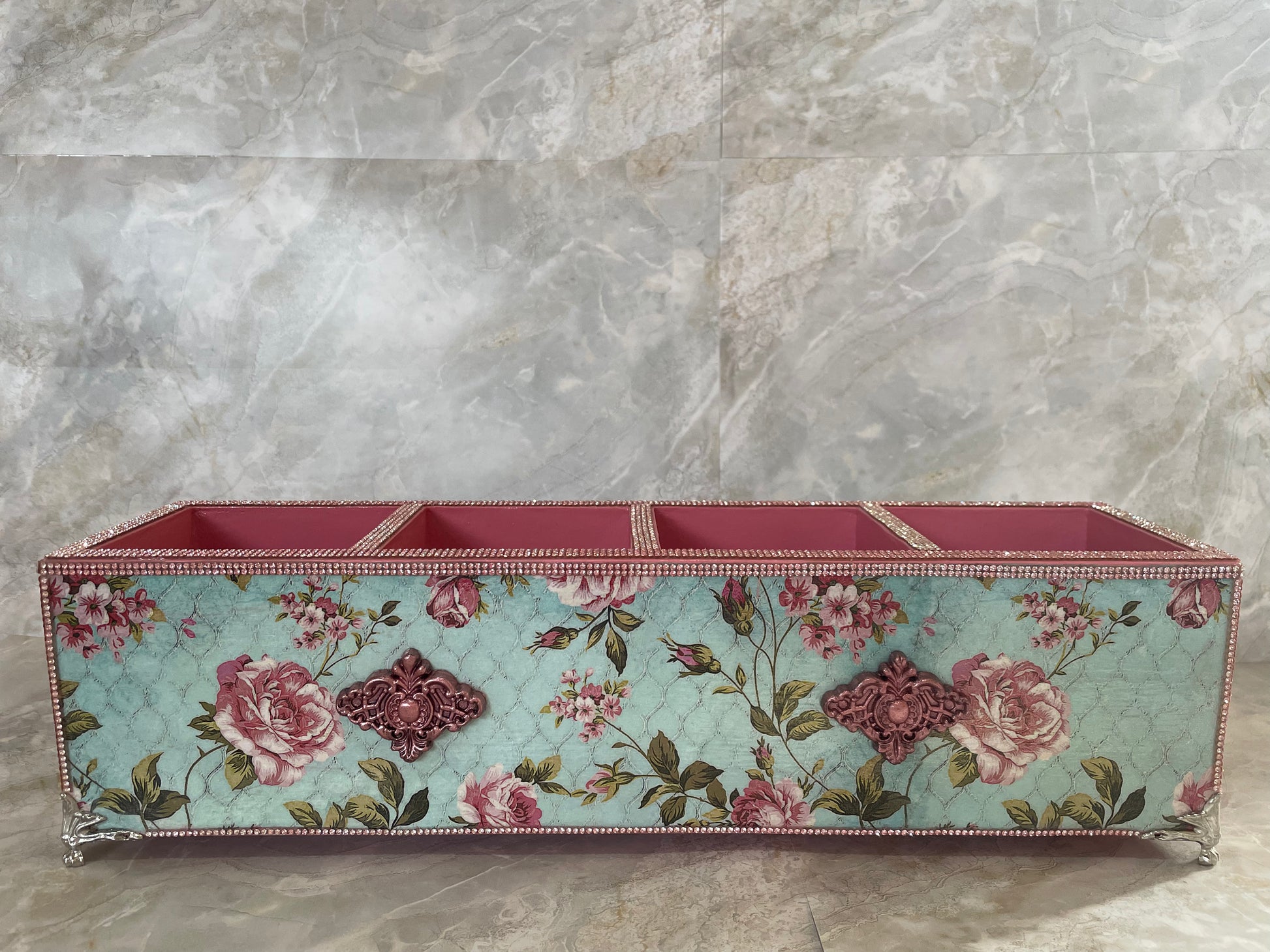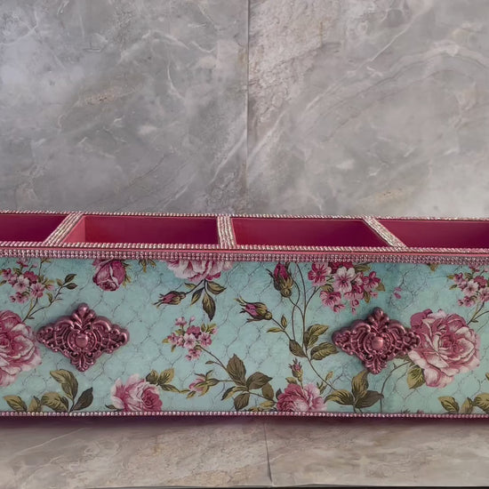 This handcrafted 4-compartment wooden organizer blends beauty and function with its elegant floral design and romantic accents. The outer surfaces feature a Decoupage Queen floral rice paper, highlighted with Pentart Chameleon Gold Varnish for a soft, luminous sheen.
