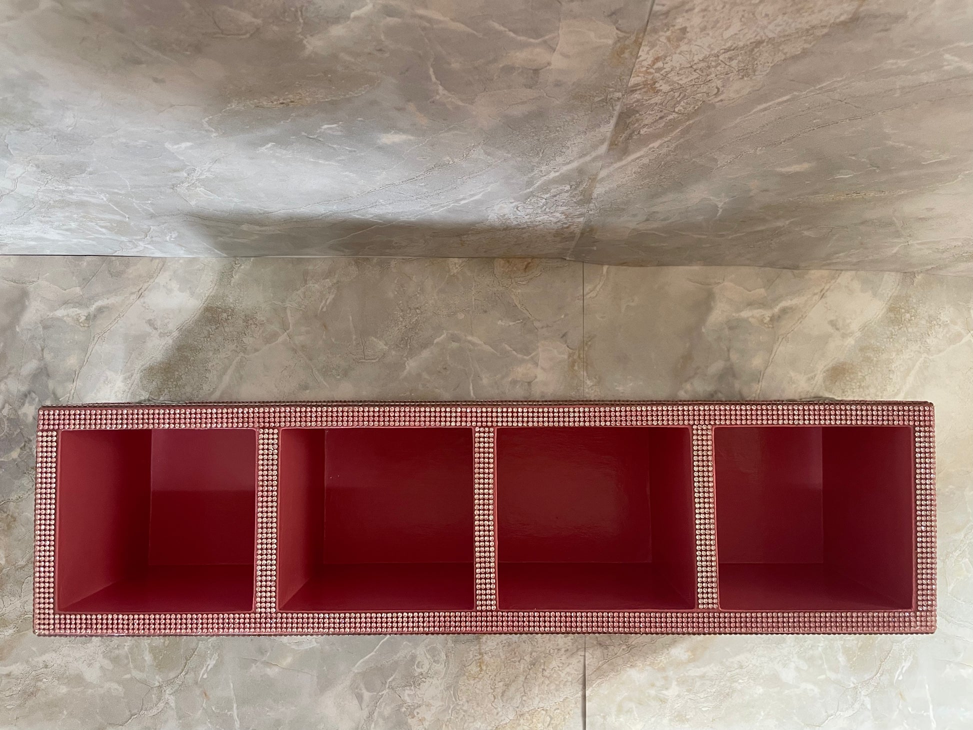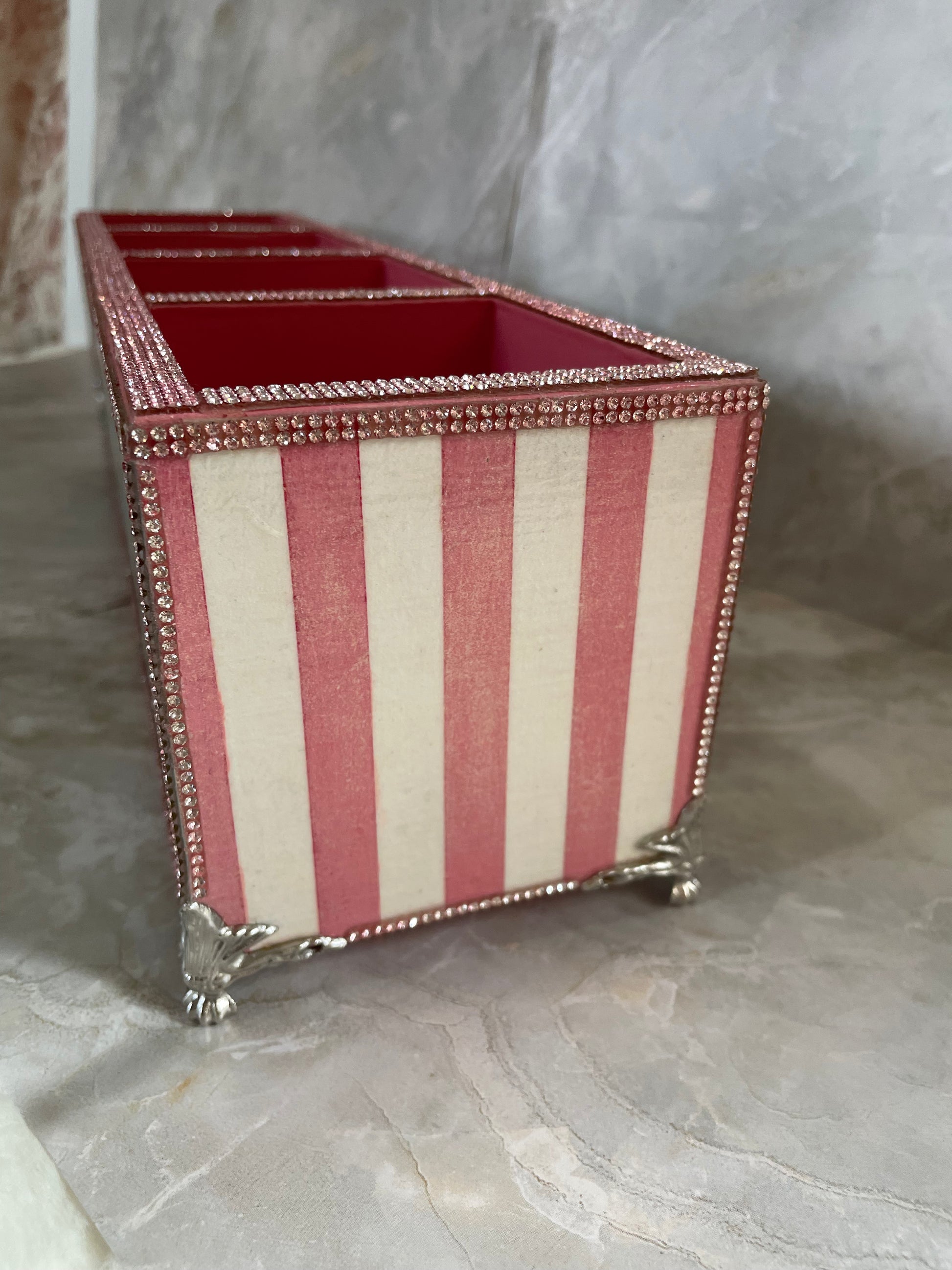 Two identical Formflex molds, painted in a sparkly pink finish, add texture and charm. Pink rhinestone trim lines the rims and borders, providing a delicate, decorative touch. The entire piece is fully varnished inside and out for durability and long-lasting protection. Silver feet complete the look, giving the organizer a refined, elevated presence.