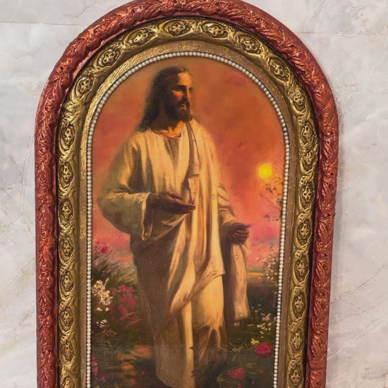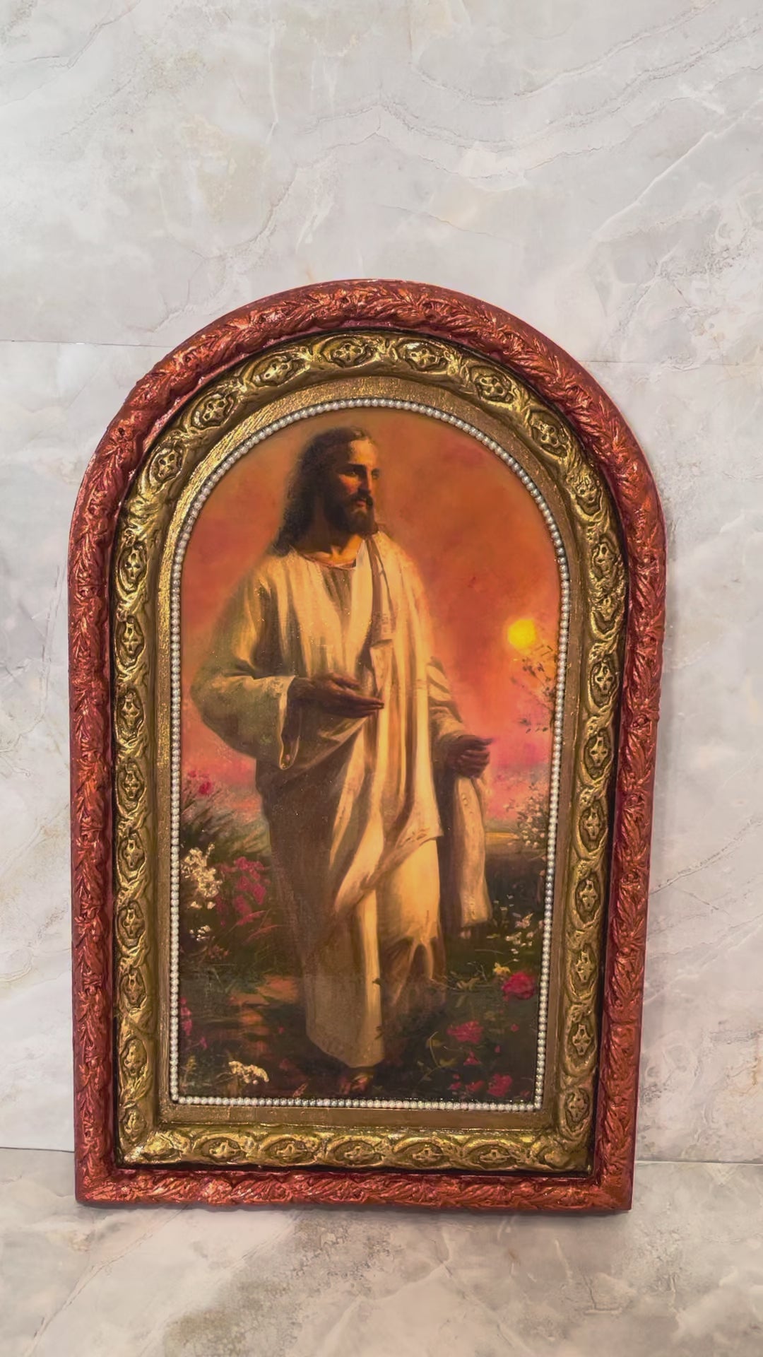 This handcrafted arched wood frame shelf sitter beautifully captures faith and serenity. It features a rice paper design from Reba Rose Creations depicting a peaceful image of Jesus walking through a garden, with His robe subtly highlighted in shimmering gold for a radiant, luminous effect. The picture is finished with Pentart’s pouring glaze, creating a smooth, glass-like surface that enhances the artwork and adds depth and elegance.